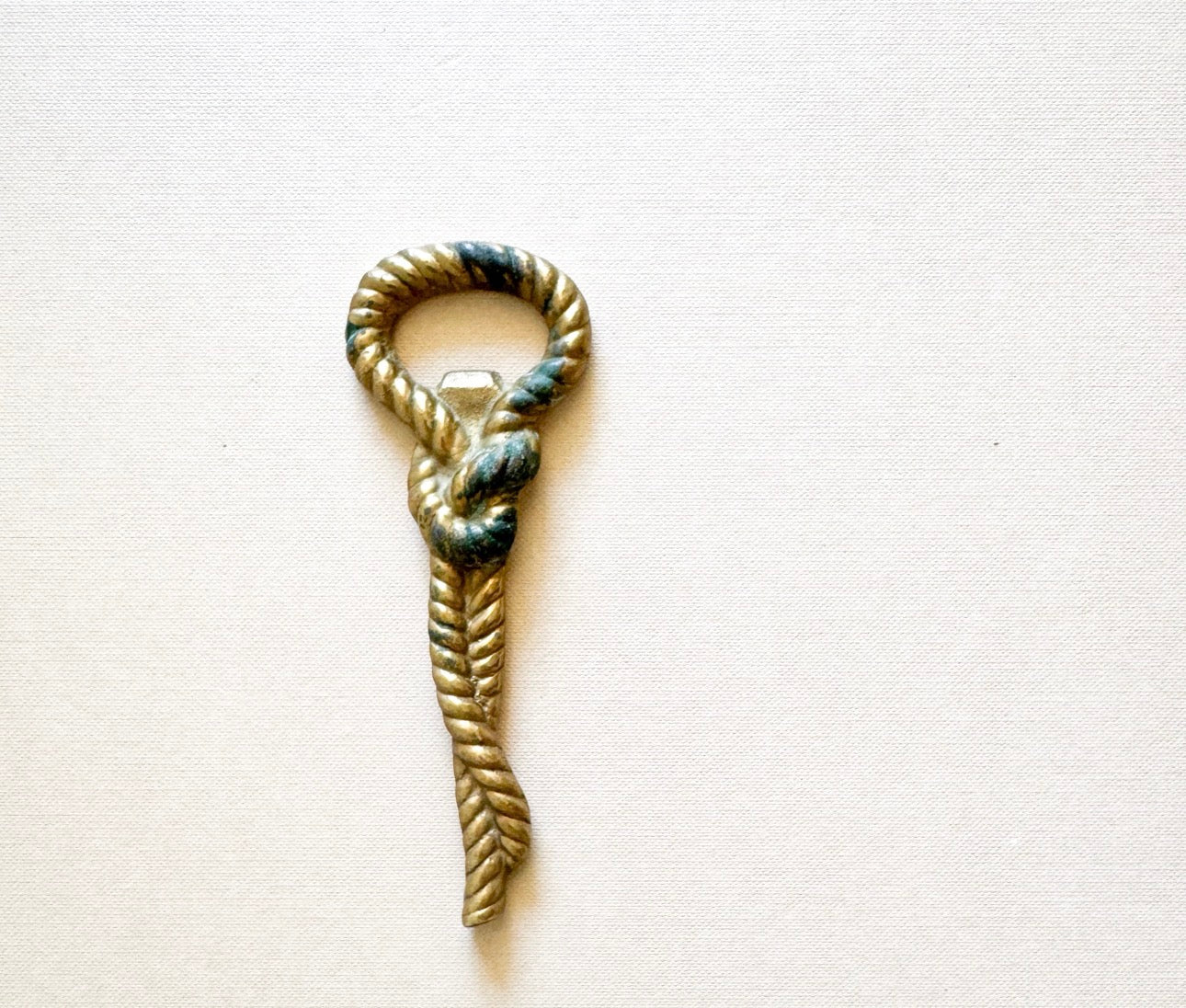 A gorgeous little nautical-meets-elegant moment. This vintage brass bottle opener is styled as a twisted rope with a knotted detail — the kind of piece that makes even cracking open a Topo Chico feel elevated. Heavy, solid brass with the prettiest patina and sculptural lines.