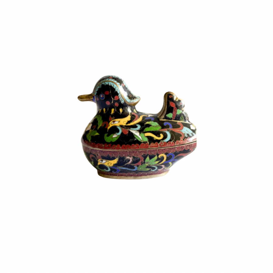 A tiny treasure with major charm. This vintage cloisonné duck box features rich enamel colors—deep black, emerald, cobalt, saffron, and ruby—outlined in classic gilded brass. Hand-worked floral and scroll motifs wrap around the entire body, giving it that unmistakable old-world, heirloom feel.